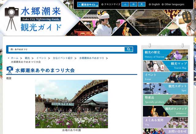 水郷潮来あやめ祭- 市営あやめ園で開催。500種100万株のあやめが咲き競うあやめ園内に架けられた橋の上から、白、紫、黄など色とりどりの花が楽しめる。シーズン中は、市営の櫓舟の遊覧舟を就航。土・日曜は、潮来踊り、嫁入舟、帆曳き船の運行など、各種イベントが行われる。